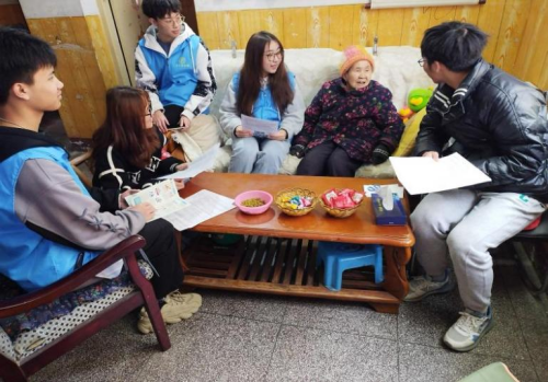 图为志愿者们与老人交谈