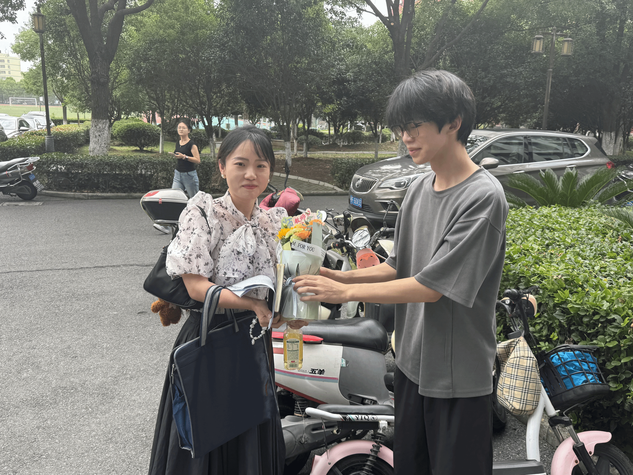 校园的林荫道旁,也留下了学生干部送花的暖心身影。当学生干部将鲜花献给老师时,老师手中的教案与文件,仿佛也因这份祝福而有了别样的温度。周围的绿树与车辆构成了宁静的校园图景,而这师生间的温情互动,成为了其中最动人的画面。
